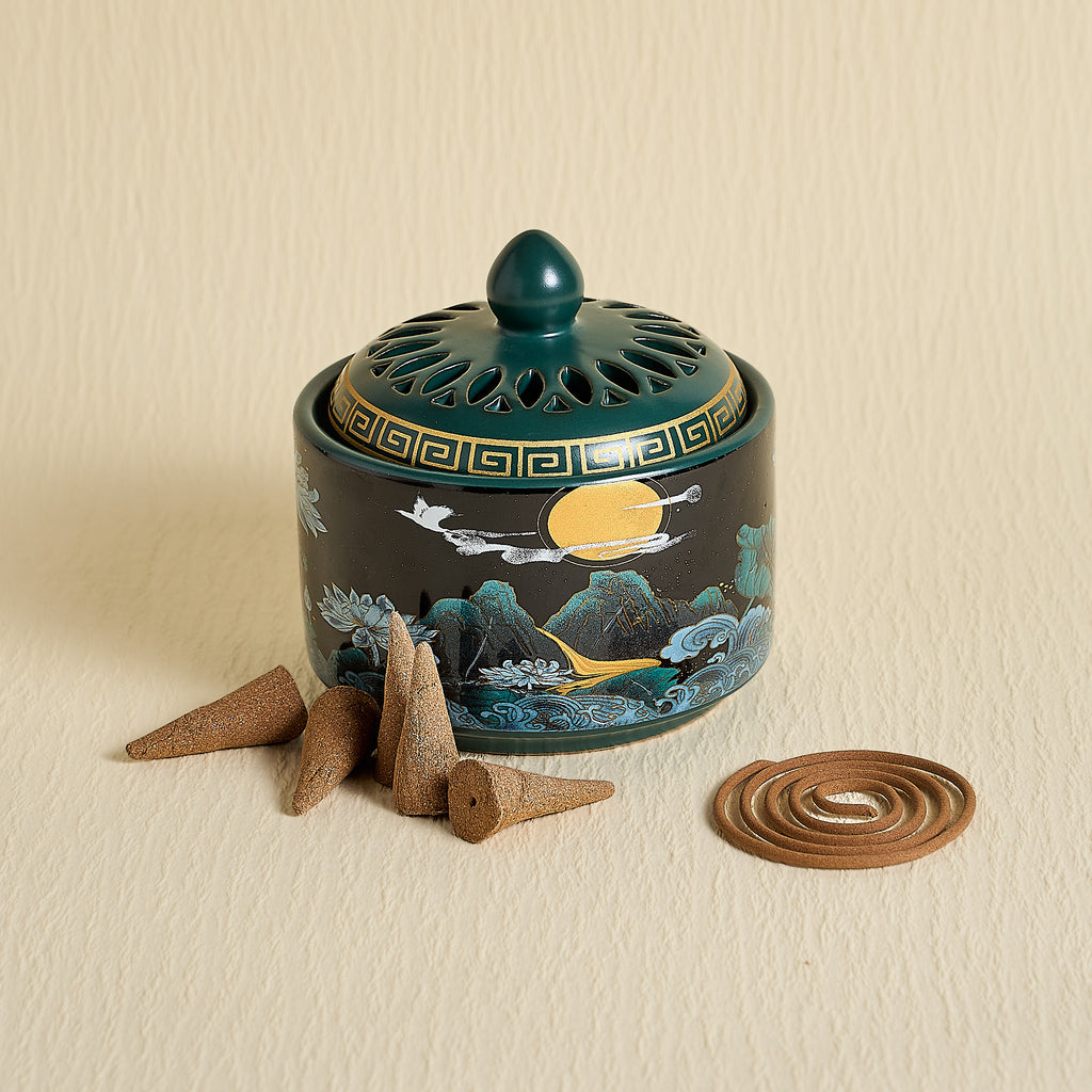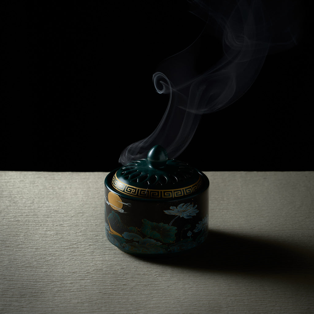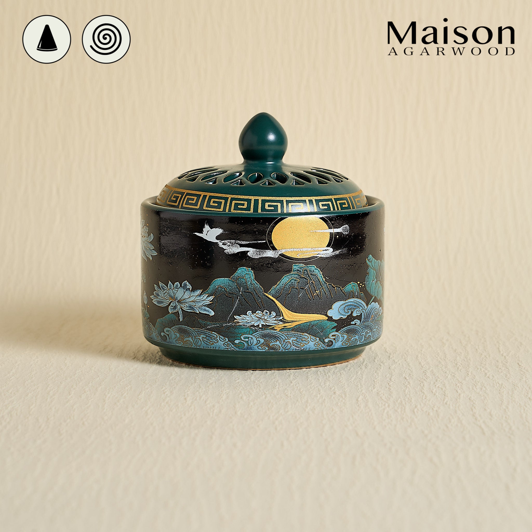 Phần lòng lư sâu và thoáng, phù hợp đặt nụ trầm chóp hoặc nhang vòng, đi kèm nắp thoát khói, tạo làn khói bay nhẹ như mây trời, đúng tinh thần thanh tịnh mà sản phẩm gợi lên.
