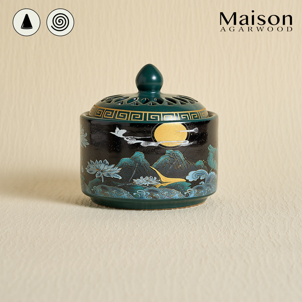Lư được chế tác từ gốm sứ chịu nhiệt, tạo hình sống động với chi tiết hạc tiên, trăng tròn, và mây bay, lấy cảm hứng từ văn hóa phương Đông và nghệ thuật thiền định.